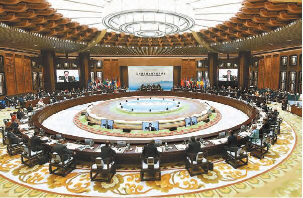 直径21米的主会议桌为大果紫檀制圆桌,由35个分部榫卯组合而成,借此传达不持偏见、不执定见、融会贯通、相辅相成的大国外交理念,也传达了世界各国经济合作过程中独立自主且合作共赢的精神。