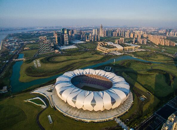 杭州国际博览中心(后方)和杭州奥体中心主体育场(8月25日摄)。