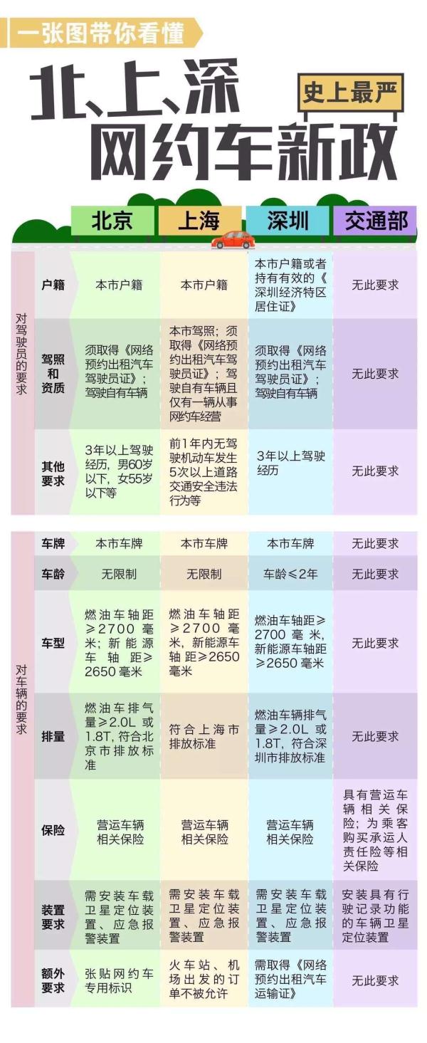上海市同日发布的网约车新规细则草案指出,上海网约车需沪籍、沪牌、拥有本市核发驾驶证件、无超过一定数量的违法违规纪录等。此外,上海版本草案还对网约车平台公司运营条件提出相应要求,包括非本市注册的企业法人应当在本市设立分支机构、网络服务平台应接入上海市交通行政主管部门行业管理平台等。深圳官方发布的徵求意见稿则规定深圳市网约车驾驶员须具有本市户籍或者持有有效的「深圳经济特区居住证」。