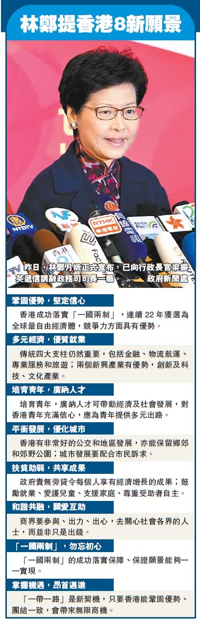 不過,上述說法林鄭並非首度提出。去年11月,她出席「灼見名家」周年論壇時就已提出「香港八大新願景」,與昨日所述相近。林鄭所提八大願景分別是:鞏固優勢、堅定信心;多元經濟、優質就業;培育青年、廣納人才;平衡發展、優化城市;扶貧助弱、共享成果;和諧共融、關愛互助;「一國兩制」、勿忘初心;掌握機遇、昂首邁進。