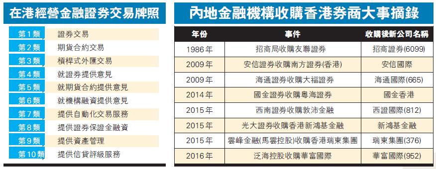 事實上,自滬港通、深港通開通以來,本港券商已成為內地資金追逐的對象。其中,最新大型收購包括全牌照券商華富國際(952)被泛海集團旗下泛海國際金融以約10.97億元收購。華富國際可謂絕無僅有的全牌照券商,持有香港證券交易、期貨合約交易、證券諮詢、企業融資等牌照。