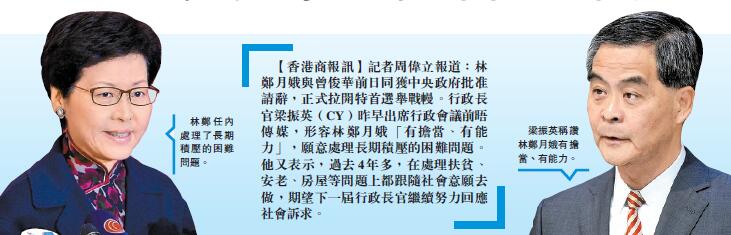 【香港商報网訊】記者周偉立報道:林鄭月娥與曾俊華前日同獲中央政府批准請辭,正式拉開特首選舉戰幔。行政長官梁振英(CY)昨早出席行政會議前晤傳媒,形容林鄭月娥「有擔當、有能力」,願意處理長期積壓的困難問題。他又表示,過去4年多,在處理扶貧、安老、房屋等問題上都跟隨社會意願去做,期望下一屆行政長官繼續努力回應社會訴求。