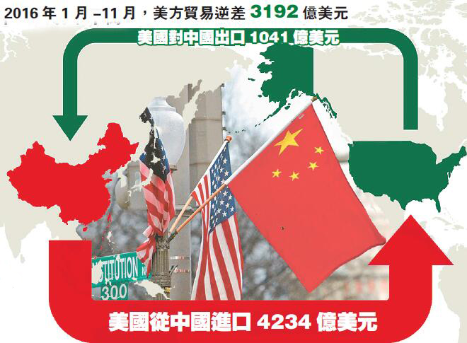 據美國商務部統計,2015年美國對中國出口1161億美元,從中國進口4832億美元,美方貿易逆差3671億美元。2016年不包含12月份,美國對中國出口1041億美元,從中國進口4234億美元,美方貿易逆差3192億美元。分析人士指出,美國對中國的貿易逆差自從中國加入WTO后的第一年后就開始不斷增大,在中國加入WTO后的十年內,隨著中美貨物貿易赤字不斷擴大,美國制造業就業人數迅速下降,這被指與中美貿易的發展結果有關。因此,當特朗普認為中美兩國之間的貿易存在不公平和不公正時,便直指中國一面操縱匯率,一面國家補貼虧損對美傾銷,從而使美國企業喪失競爭力。