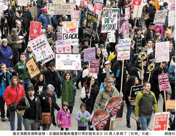 總統就職日前后,特朗普反對者組織的抗議示威規模打破以往總統就職日的相關示威紀錄。昨日,首都華盛頓和美國多地還將舉行名為「婦女大游行」的抗議活動,僅華盛頓預計參與人數就達20萬。有分析指出,特朗普以「讓美國再次偉大」的口號成功入主白宮,不過他不是傳統的政治人物,其國內外政策走向引人關注。據悉,約有60位民主黨國會議員沒有參加特朗普的就職典禮,特朗普就任后面臨着彌合國內分裂的任務。