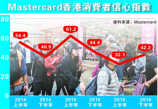 本港方面,Mastercard最新公布的2016年下半年消費者信心指數顯示,香港消費者信心水平由2015年上半年61.2,急跌至當年下半年的44.4;2016年上半年,更進一步跌至32.1水平。繼2015年下半年至去年上半年持續下跌後,港人對未來經濟前景的信心,已較過去半年有顯著改善,升幅是亞太區內最高。2016年下半年香港整體消費者信心指數為42.2,較上半年32.1急升10.1點。