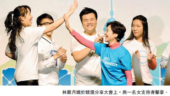 林鄭月娥昨日於灣仔會議展覽中心舉行「競選分享大會」;大會舉行地點為會展舊翼1樓的會議廳,地方頗為寬敞;大會獲逾800人到場支持,雖然場面盛大,但氣氛其實輕鬆;其競選口號「同行 We Connect」;台上的布景板以藍天下的維港為背景,並寫了上述競選口號,配上淺白字樣「關心 We Care」、「行動 We Act」、「聆聽 We Listen」。