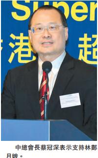 蔡冠深昨早出席中總春節酒會後向傳媒透露:「兩位前司長(參選人林鄭月娥及曾俊華)都係好人選,但都要兩位揀一位。我同佢(林鄭月娥)?工作關係,同埋佢同我傾??,密切脗合;中總已於前日將18張提名表格交予林鄭月娥。」他重申,未來投票的決定亦會一致,不會改變。