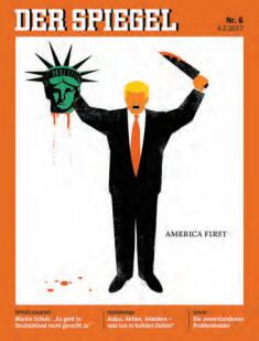 《明鏡》周刊的封面上,特朗普的面部只有嘴,沒有鼻子和眼睛,身穿黑色西服、白襯衫,打着鮮紅色領帶,一手拿着沾染鮮血的長刀,另一手握着美國紐約自由女神像的頭顱,頭顱流淌着鮮血。圖片所配文字為:美國第一。