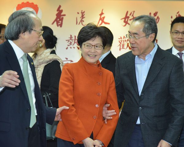 全國政協常委唐英年(右)拖著林鄭月娥(中)傾密偈,左為友協會長戴德豐。 記者 蔡啟文攝