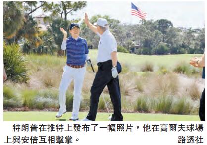 【香港商报网讯】特朗普当地时间11日邀请到访的安倍晋三,前往他在佛州的私人度假村位於丘比特镇的高尔夫球场切磋球技。记者没有获安排采访,但特朗普其后在推特上发布一幅照片,见到他和安倍都举高手互相击掌,未知是否打出一个好球。但当他们享受打球时,两位第一夫人梅拉尼娅和安倍昭惠去了附近的博物馆和日式庭园参观。