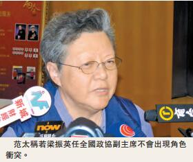 梁振英日前獲增補為全國政協委員,對於其或會晉升為全國政協副主席的消息,全國人大常委范徐麗泰回應道,若果消息屬實,不會出現角色衝突的問題,也不會影響「一國兩制」。她指,政協本身要做的是提意見,而不是做決定;而且中央做決定,也是為香港好,不會對香港不利。