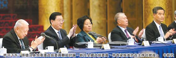 昨日下午,張德江出席港澳地區全國政協委員聯組會議。進入北京飯店金色大廳會場時,張德江先和在場港澳地區全國政協常委、政協委員一一握手。陪同出席會議的包括統戰部部長孫春蘭,全國政協副主席董建華、何厚鏵、李海峰,國務院港澳辦主任王光亞,香港中聯辦主任張曉明、澳門中聯辦主任王志民;新增補為全國政協委員的香港特首梁振英亦在主席台就座。