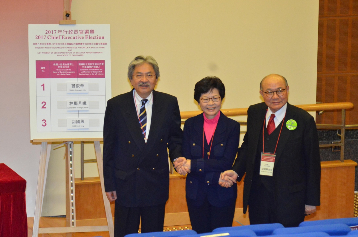 另外,選舉管理委員會昨午舉辦行政長官選舉簡介會,向候選人講解競選活動時應注意的重要事項和選舉安排。3名候選人林鄭月娥、曾俊華、胡國興均有到場,3人在開場前有握手示好,稍後選舉主任朱芬齡法官以抽籤形式,決定3人在選票上的排名次序,分別是1號曾俊華、2號林鄭月娥、3號胡國興。